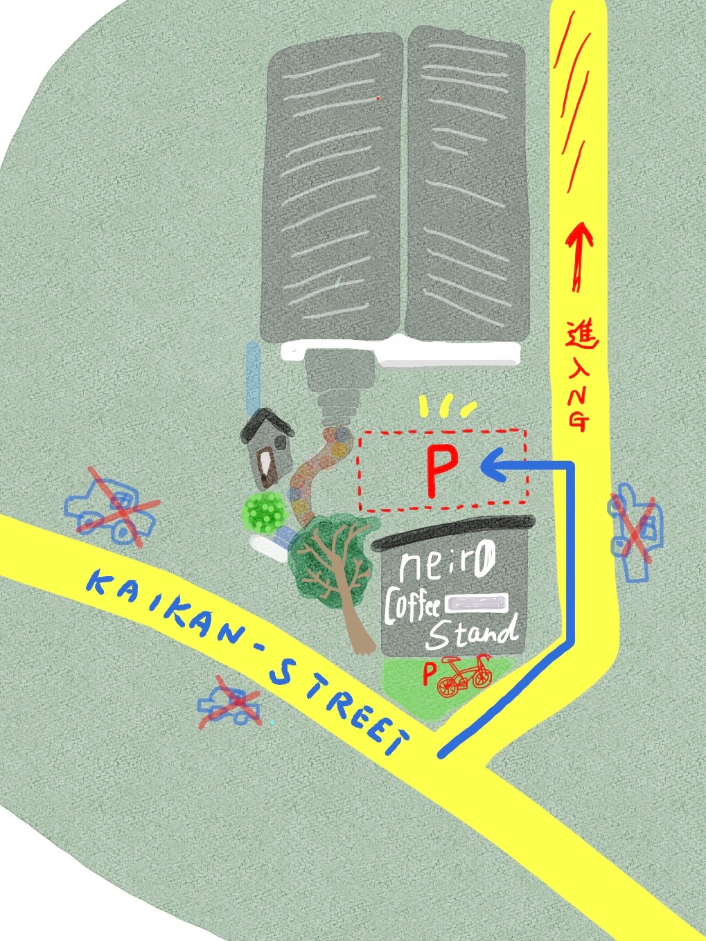 駐車場より先に進入・切り返しすることは近隣の方々の迷惑になるのでご遠慮ください